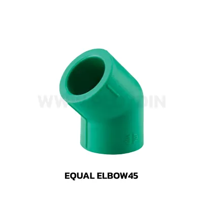 EQUAL ELBOW 45 PPR ( ข้องอ 45 องศา PPR ) SDR6 PN20 ผลิตตามมาตรฐาน DIN ซึ่งเป็นมาตรฐานเยอรมัน ผลิตจากวัสดุ Polypropylene Random Copolymer (PPR) เป็นฟิตติ้งสำหรับเชื่อมต่อท่อ PPR ที่มีรูปร่างเป็นมุมฉาก 90 องศา ใช้สำหรับเปลี่ยนทิศทางการไหลของน้ำในระบบท่อ ทำให้สามารถออกแบบระบบท่อให้มีความยืดหยุ่นและเข้ากับพื้นที่ได้มากขึ้น ขนาดดูได้จากตารางด้านล่างนี้